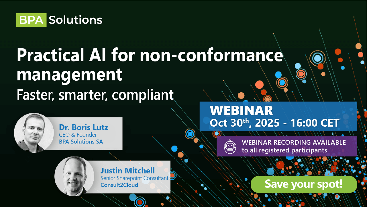 Join Justin Mitchell, Senior SharePoint Consultant at Consult2Cloud, and Dr. Boris Lutz, CEO and founder of BPA Solutions, for a hands-on live session to see how GenAI is seamlessly embedded into our Microsoft 365-powered eQMS to tackle non-conformance management in real-life scenarios.